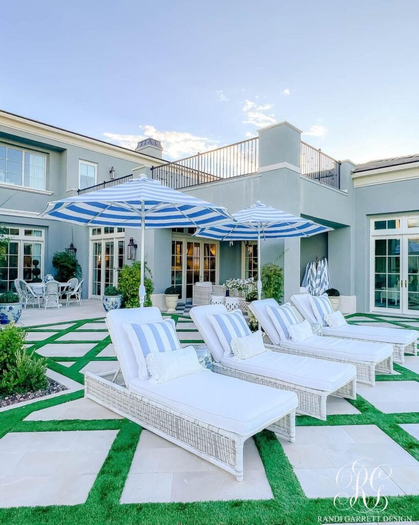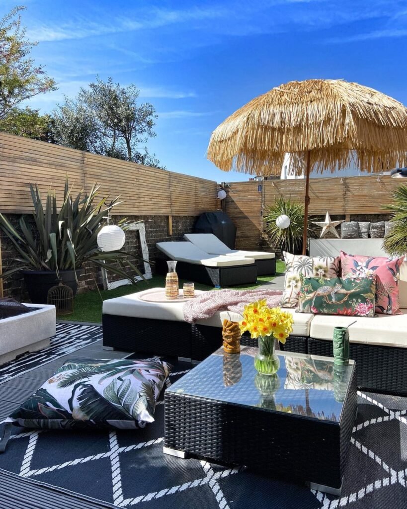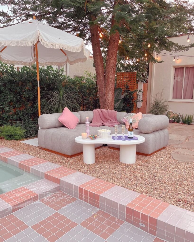 Add shade and style to your backyard with vibrant umbrellas. Mix bold patterns or try textured designs like fringes and tassels for a boho-chic vibe. They’re practical for sunny days and instantly make your space feel like a tropical escape.
