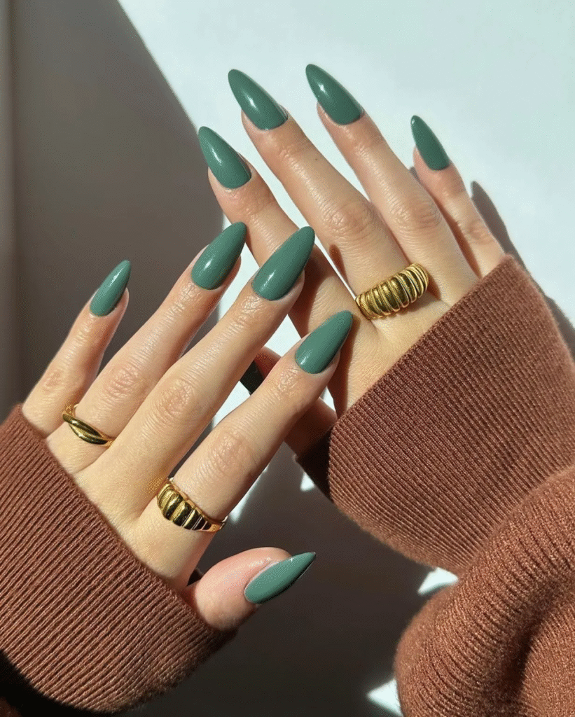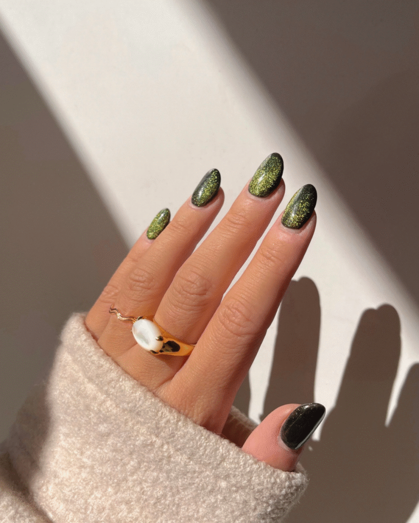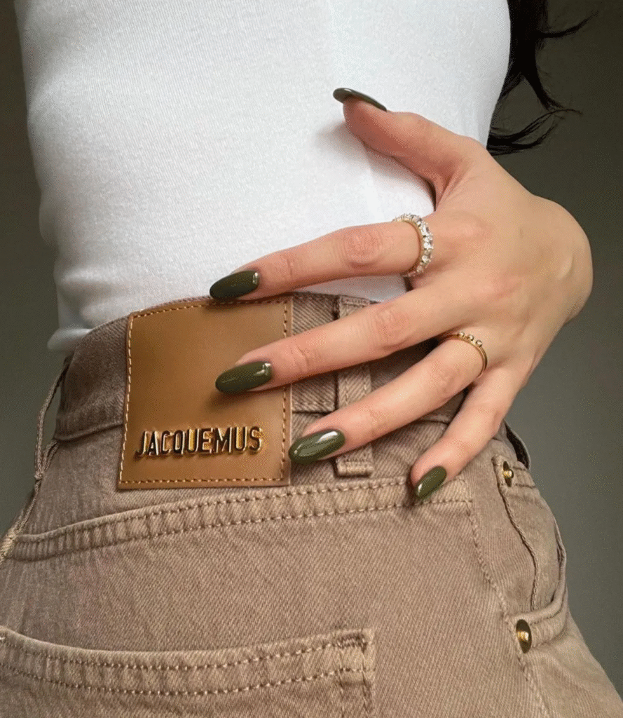 Meet your new It girl fall shade — olive green! Also called the “dirty martini mani,” this look is effortlessly chic with just a touch of edge. Add a soft shimmer to mimic that martini-glass glow, and you’ve got the perfect combo of classy and cool for autumn 2025.