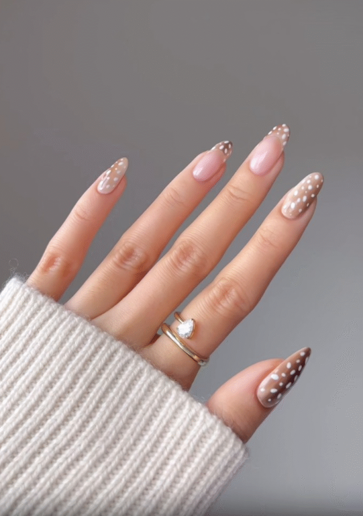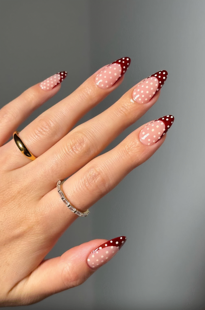 Polka dots are the go-to trend for fall 2025 — and they’re taking over nail art too! Add a playful twist to your classic French manicure by dotting tiny spots along the tips. Burgundy or deep fall tones make this look feel cozy yet chic, giving your nails a fun seasonal upgrade that’s easy to DIY.