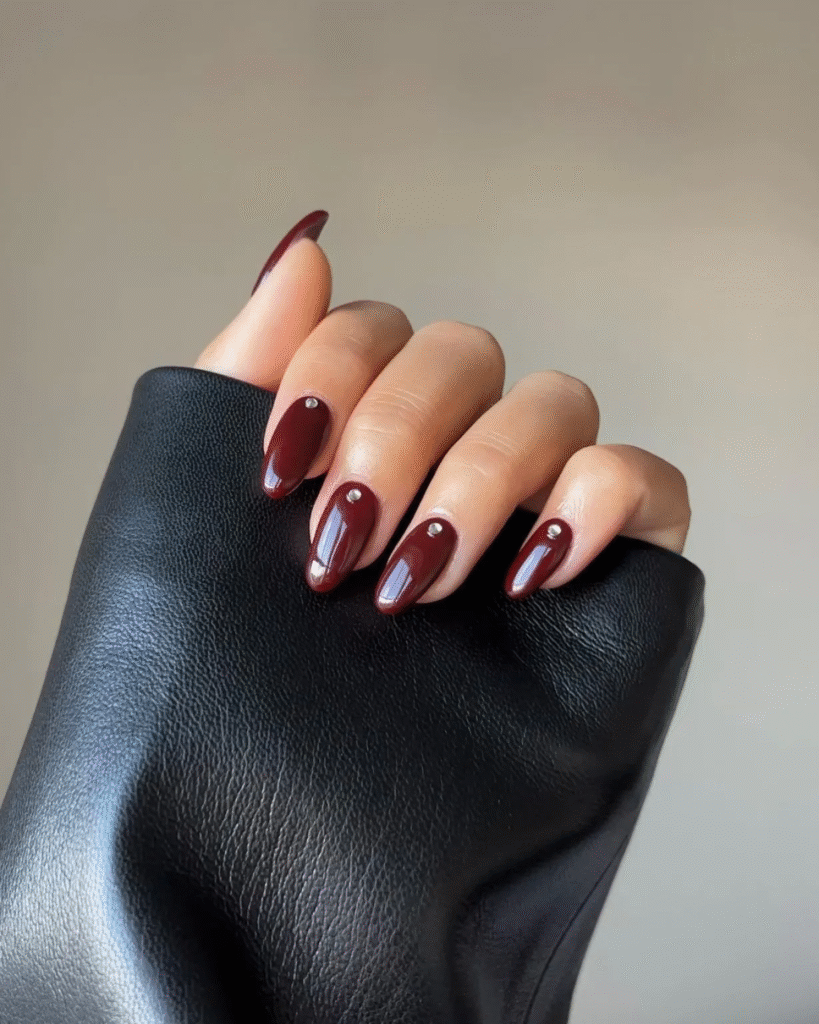 Add a little edge to your fall manicure with this chic studded nail trend! 3D crystals and tiny studs bring just the right amount of sparkle without feeling over the top. Try adding a few dainty gems over nude or clear polish for a subtle, stylish vibe — perfect for pairing with your favorite fall leather jacket.