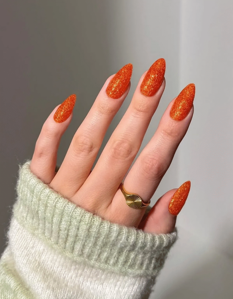 Step into your showgirl era with this sparkly orange shade — Taylor Swift–approved and perfect for fall! This glittery hue brings major main-character energy, adding warmth and shimmer to your look. Pair it with your favorite playlist and a cozy sweater for the ultimate autumn vibe.