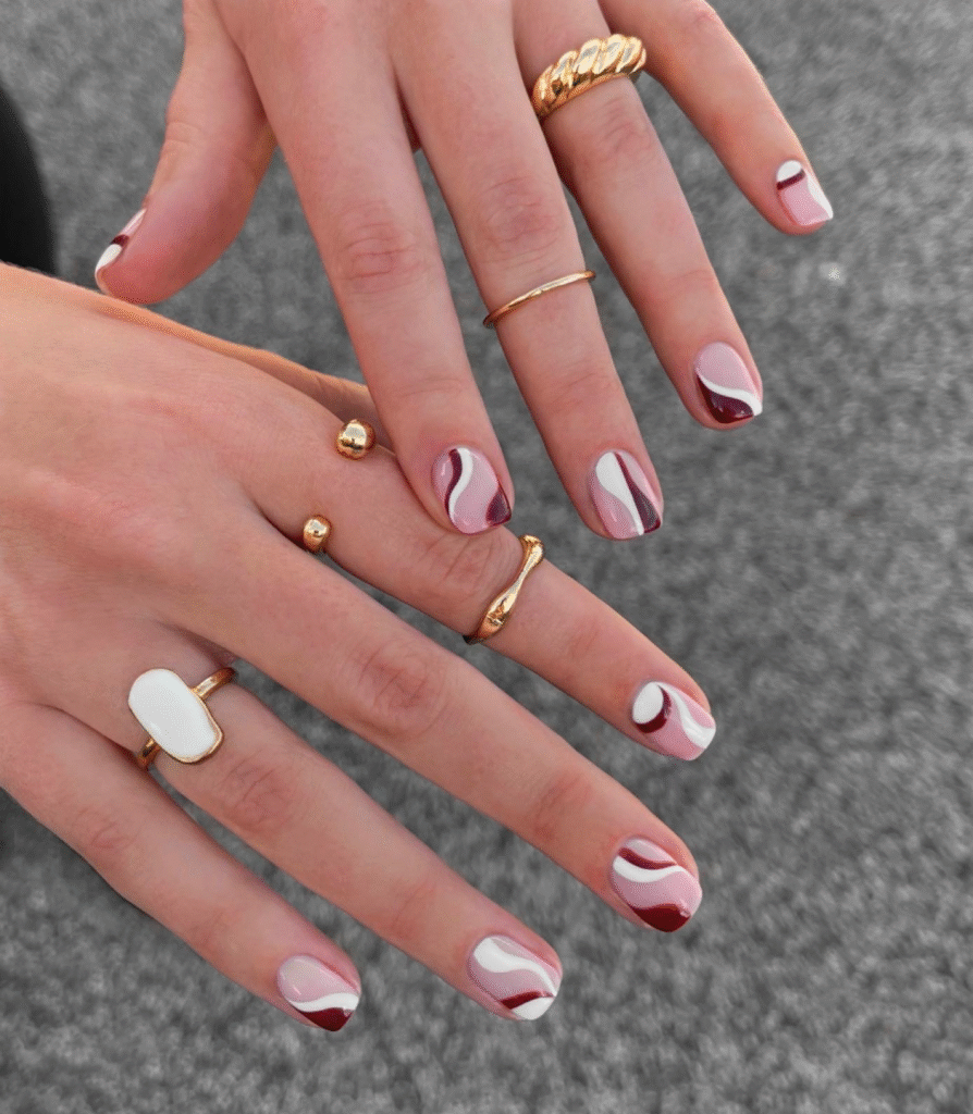 Bring some ’70s vibes to your fall manicure with these fun retro swirl nails! Maroon and white swirls create a playful, psychedelic look that’s totally groovy. The best part? Each nail can be a little different, so you can freestyle and make the design uniquely yours.