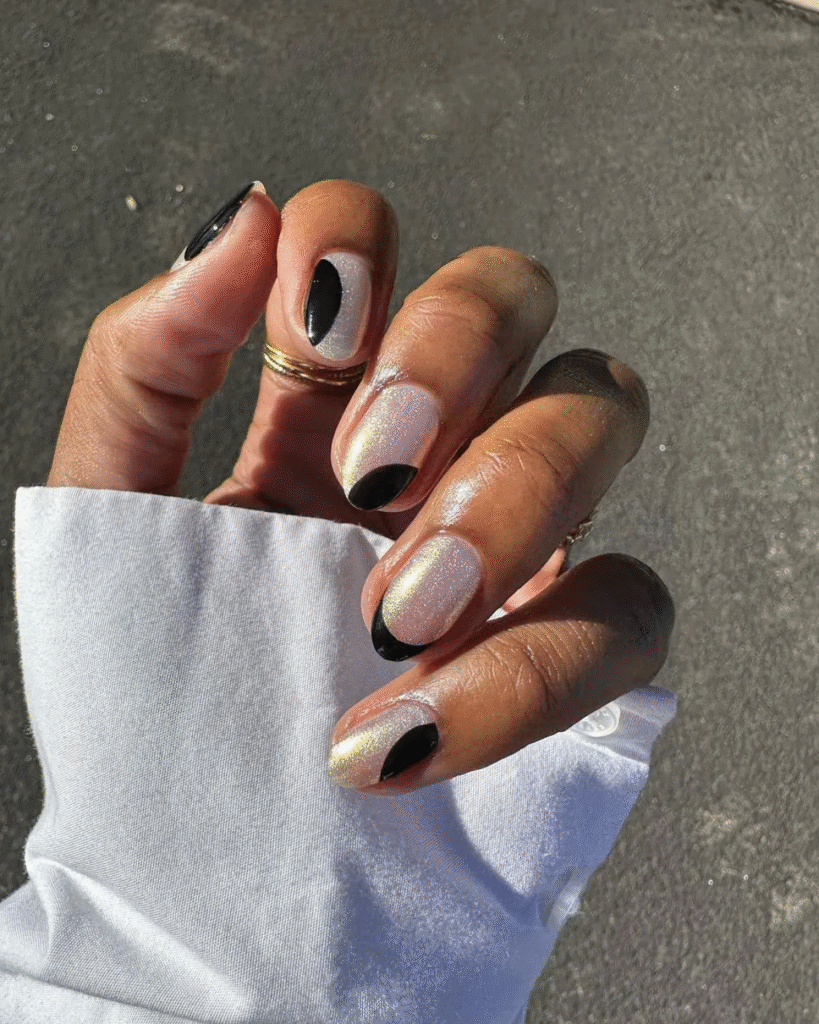 Give your short nails a modern twist with negative space and black glitter! This edgy design adds a cool, graphic vibe while keeping it simple. The glittery black polish elevates a classic mani into a chic, standout fall look.
