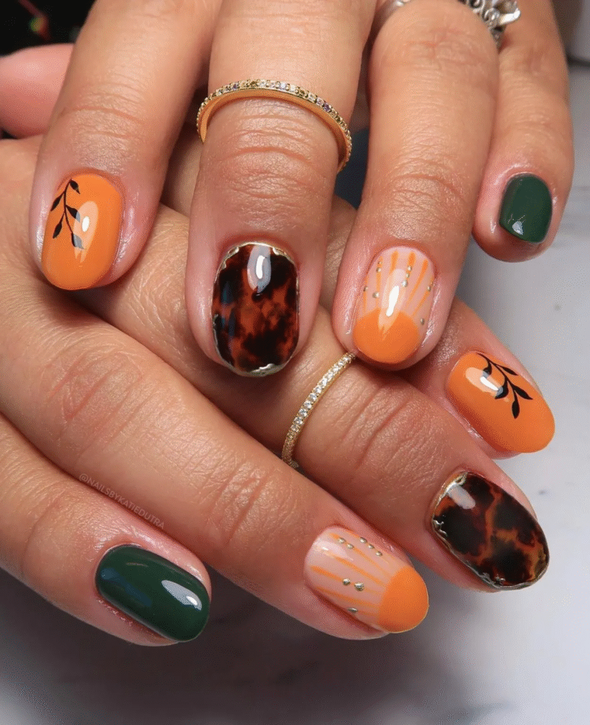 Who says you need just one nail design? This mismatched fall manicure mixes tortoiseshell, deep greens, and hints of gold for a bold, trendy look. Stick to a cohesive color scheme to keep it stylish, and you’ve got the ultimate autumn-inspired statement mani.