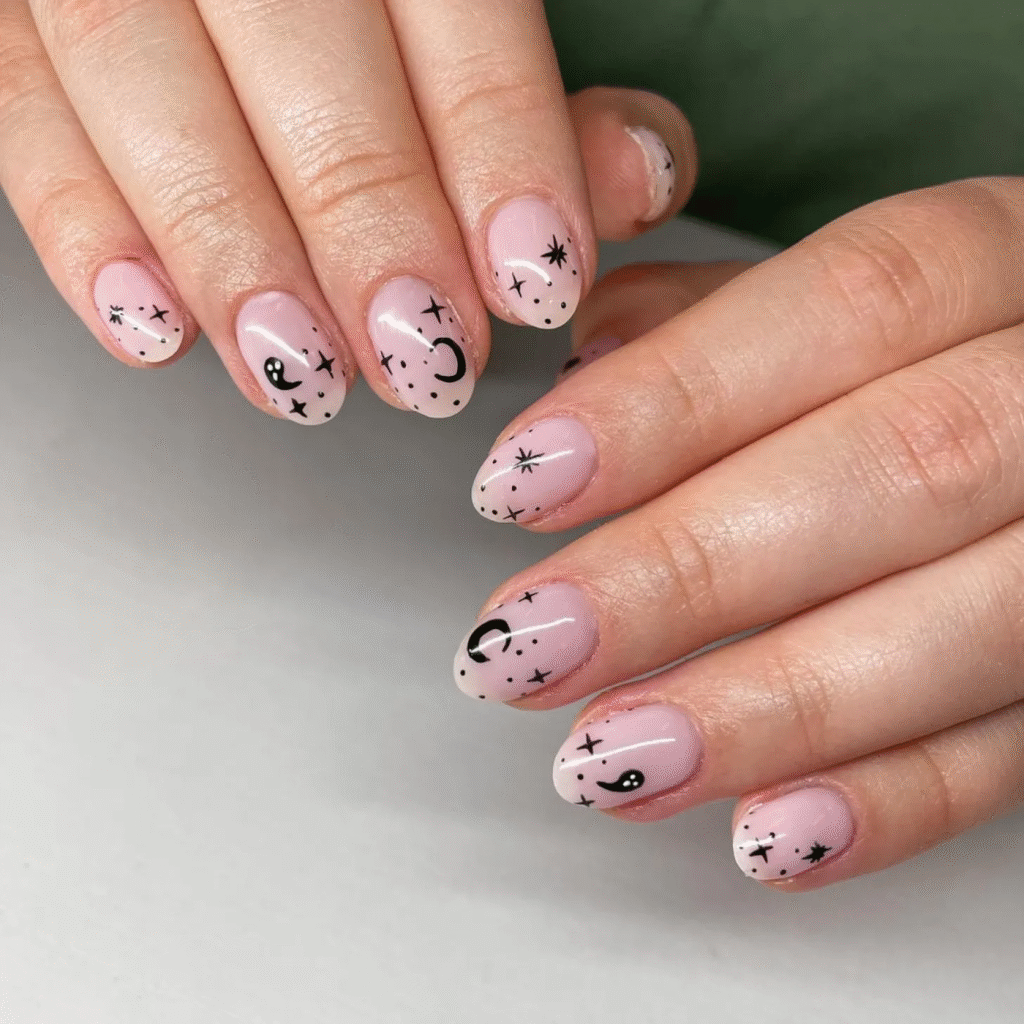 Polka dots aren’t just for long nails — short nails look amazing too! This fall-inspired design pairs a sheer black base with delicate dot accents for a chic, modern twist on the classic black manicure. Simple, stylish, and perfect for the season.