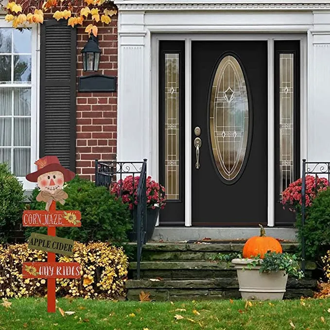 Add instant fall charm to your porch with a rustic wooden sign featuring seasonal phrases like “Corn Maze” or “Apple Cider.” It’s quick, hassle-free, and the perfect way to bring cozy autumn vibes to your outdoor space.