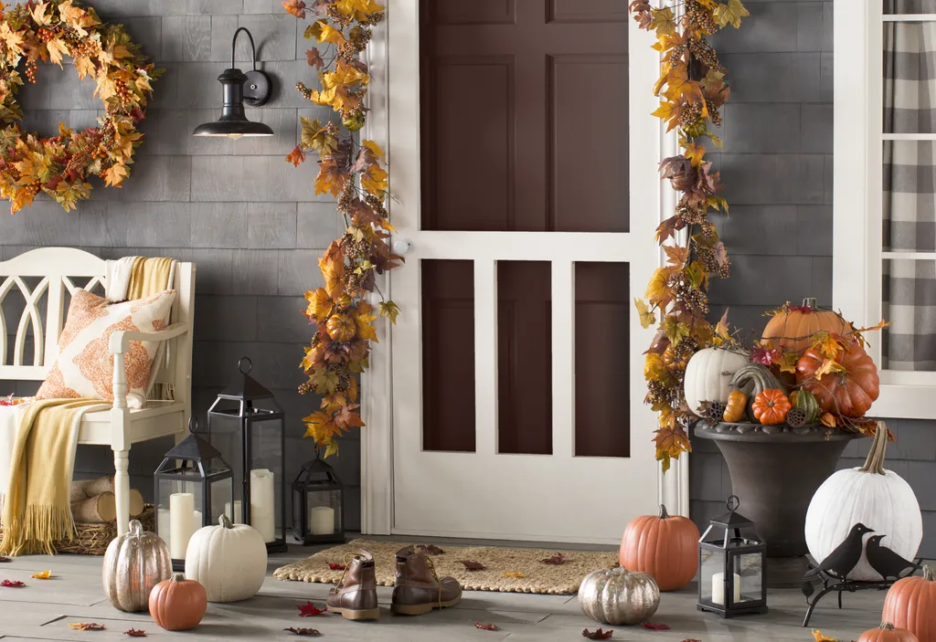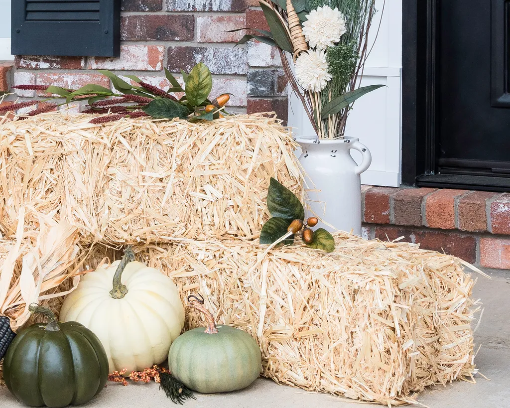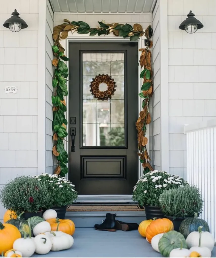 If the classic orange-and-red fall palette isn’t your style, try a softer, more neutral approach. Use creamy white pumpkins, rustic green accents, and muted tones for a fresh and modern fall porch look. You can even DIY your décor by spray-painting leaves, pumpkins, or berries to match your aesthetic. Complete the setup with decorative hay bales, white chrysanthemums, and dried grasses for a cozy, farmhouse-inspired vibe.