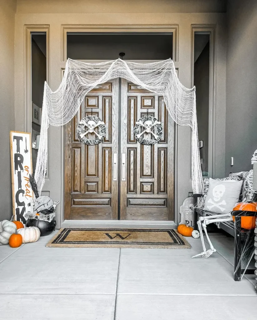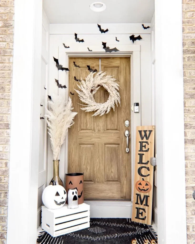 If your style leans toward a chic and modern vibe, this monochrome porch décor idea is perfect for you. To recreate the look, gather some pampas grass, a creamy faux wreath, paper bats, and a stylish welcome sign. Add a few painted pumpkins — a fun project to get the kids involved in — and you’ll have a stunning setup that’s simple yet elegant. This cozy and minimal porch design is the ultimate fall statement.
