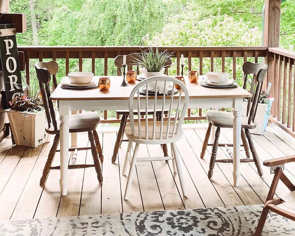 Give your outdoor dining area a cozy fall vibe with war,m earthy tones, soft rugs, and glowing candles. Add copper mule mugs and a charming chalkboard for a welcoming touch. If you live in a warmer climate, take advantage of the season and enjoy your Thanksgiving dinner right on the porch.