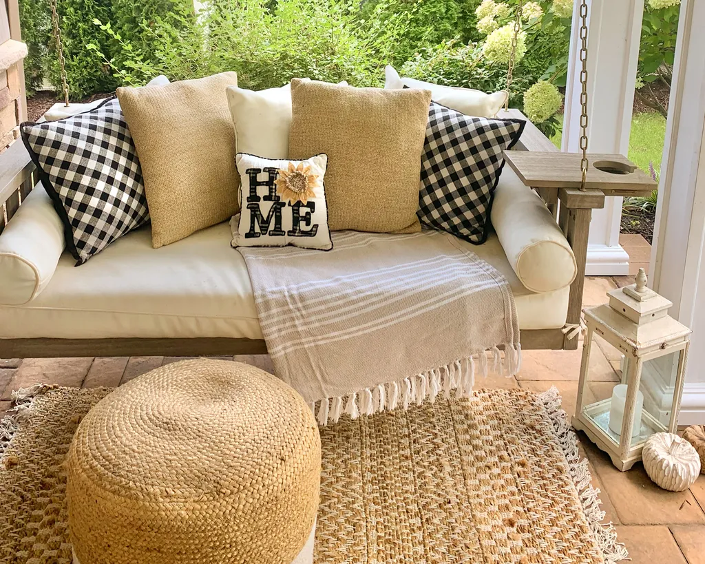 As the chill of fall sets in, make your porch feel extra warm and inviting with layers of cozy décor. Add soft blankets, chunky knit throws, textured pillows, and patterned rugs to create a snug retreat perfect for crisp autumn evenings. Design expert Dunford suggests “decorating with the five senses in mind,” so bring in tactile materials like sherpa, flannel, and sweater-knit textures to make your porch irresistibly cozy — like wrapping your home in a warm hug.