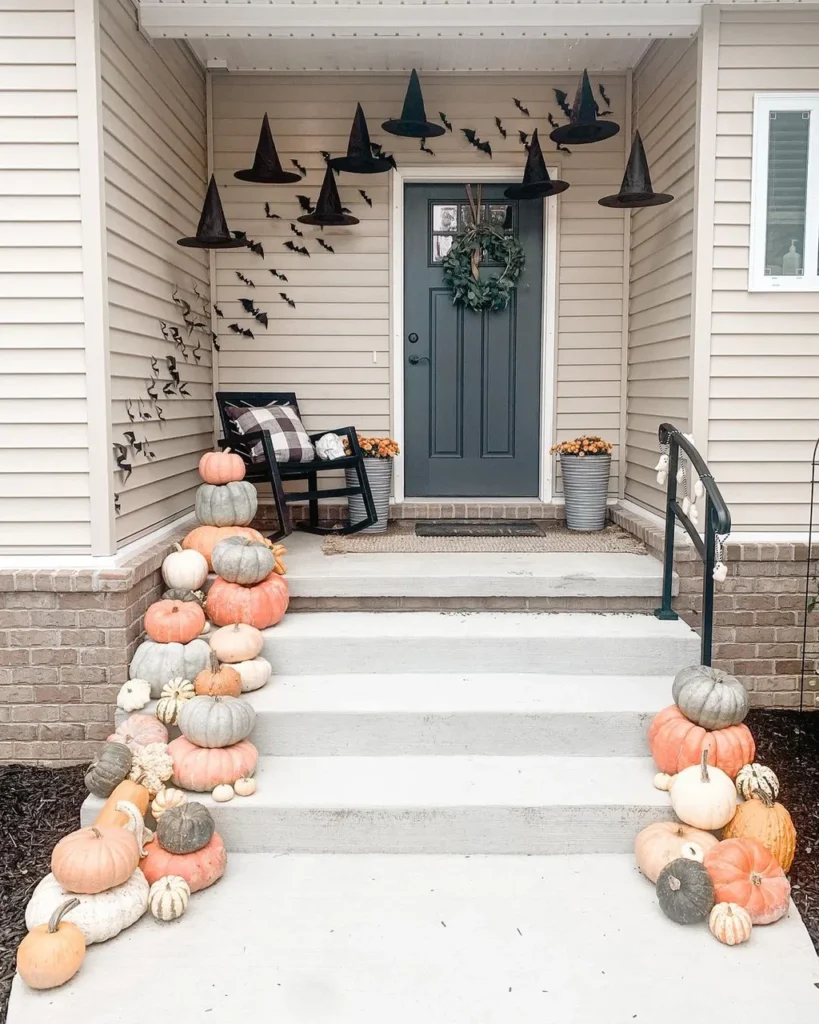You can never go wrong with stacking pumpkins on your porch — especially as Halloween approaches. The trick is to mix different shapes, sizes, and colors to create a layered, natural look. Place the larger pumpkins on the edges, fill in the gaps with smaller ones, and let the variety bring charm to your steps. For extra flair, add fun touches like witch hats on clear strings, paper bats, and maybe even a cozy rocking chair to complete the perfect fall vibe.