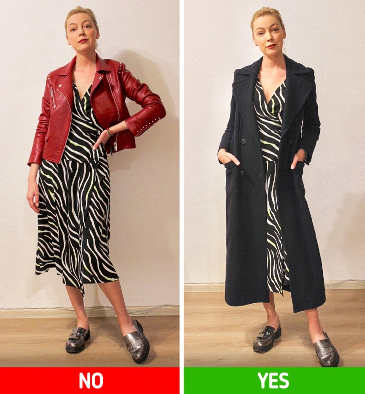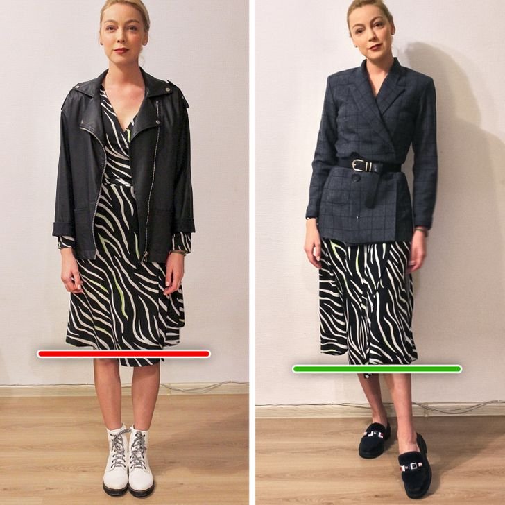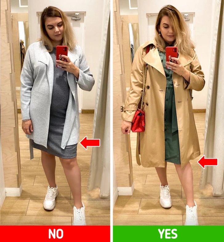 The way your jacket falls can change how your body looks. Jackets that hit around mid-thigh or just below the hips create longer, more streamlined lines. Wearing your jacket open enhances this effect, forming a smooth vertical line that makes your outfit feel lighter andmore balanced. Avoid sharp horizontal lines at the waist, which can make your shape appear boxy. Soft tailoring, gentle drapes, or flowing shapes keep your look flattering and effortless.