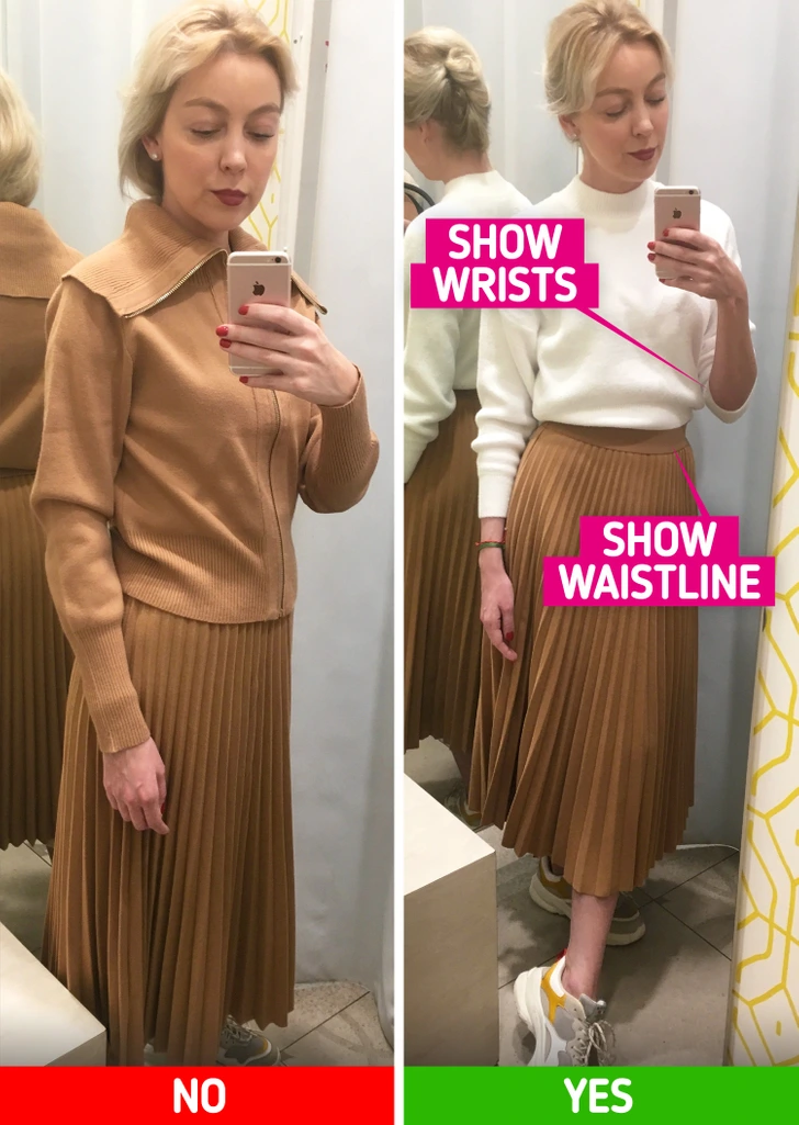 When you’re feeling unsure, it’s easy to hide behind loose, oversized clothes. But covering everything often makes your outfit look heavier than it needs to be. Showing small areas like your wrists, waist, or neckline helps create balance and natural shape. These details draw the eye to lighter, slimmer points of your body. You don’t have to reveal a lot—just a little skin goes a long way. It’s an easy trick that instantly makes outfits feel softer and more flattering.