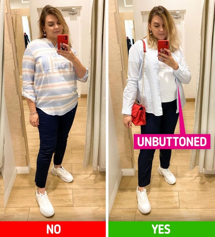 Pulling your top down too far might feel safe, but it can actually work against you. When a long shirt cuts across your hips—especially with contrasting bottoms—it can shorten your legs and widen your middle. Instead of hiding your shape, it breaks up your outfit. A simple half-tuck or front tuck instantly creates better proportions. Adding an open cardigan or jacket also helps lengthen your frame. Small styling tweaks like these make your look feel cleaner and more flattering.