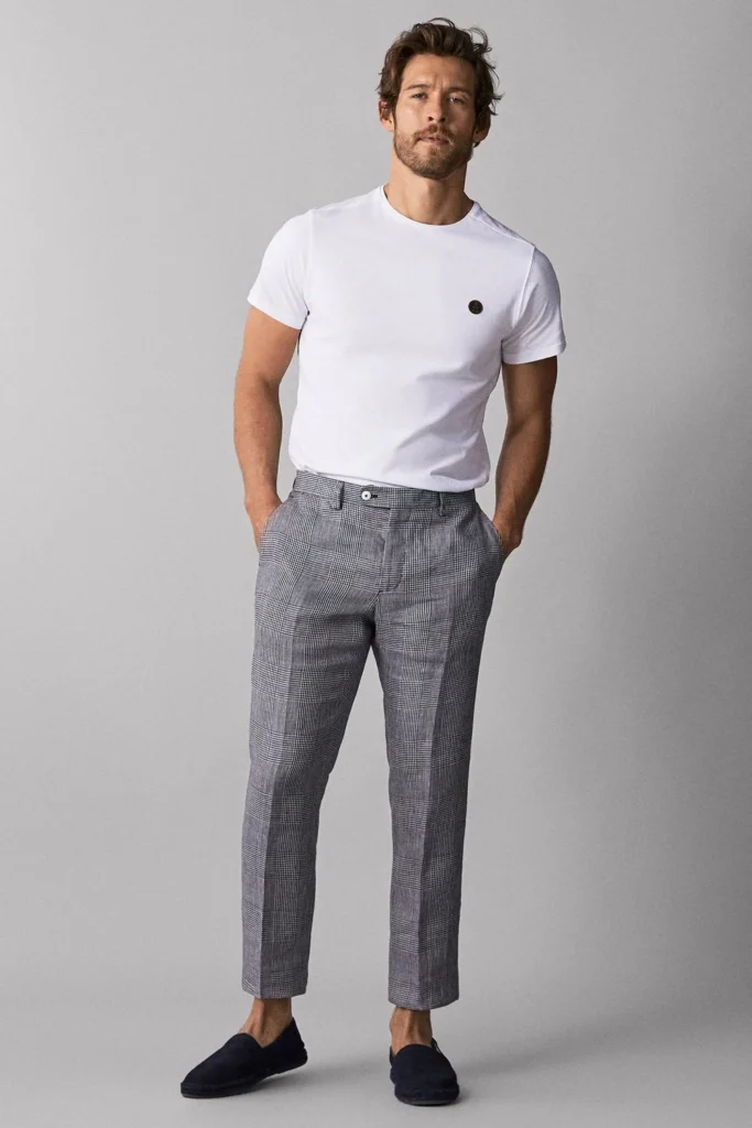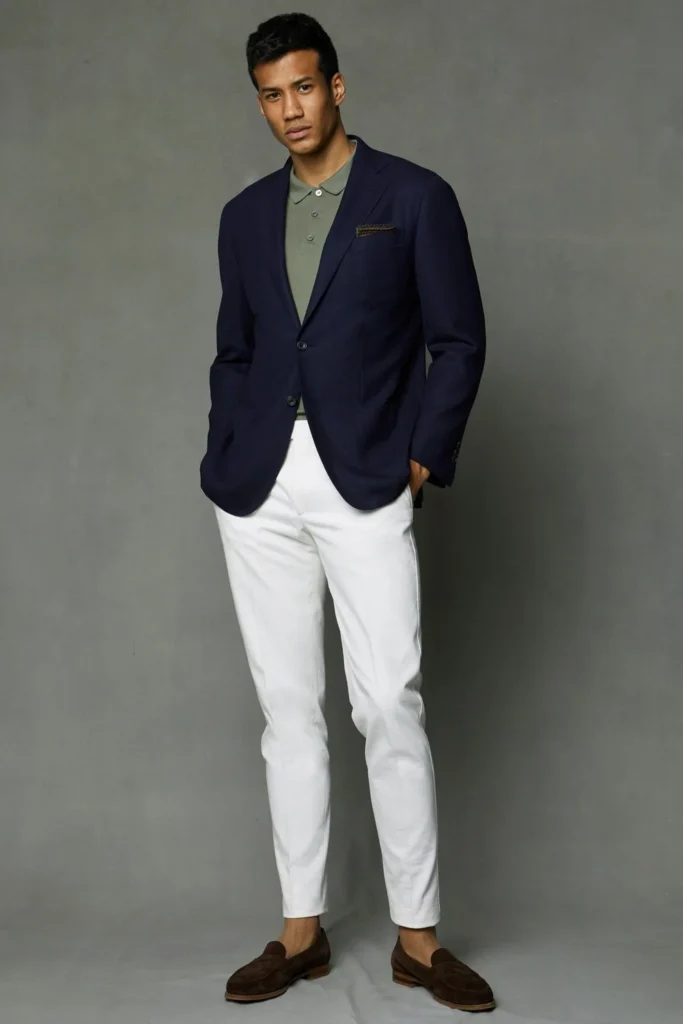 Looking sharp in summer doesn’t mean sacrificing comfort. The key is choosing lightweight, well-fitted pieces that still feel professional. Cropped trousers or white chinos paired with suede loafers set the foundation, while a polo, quality T-shirt, or light jacket keeps the look relaxed yet refined.