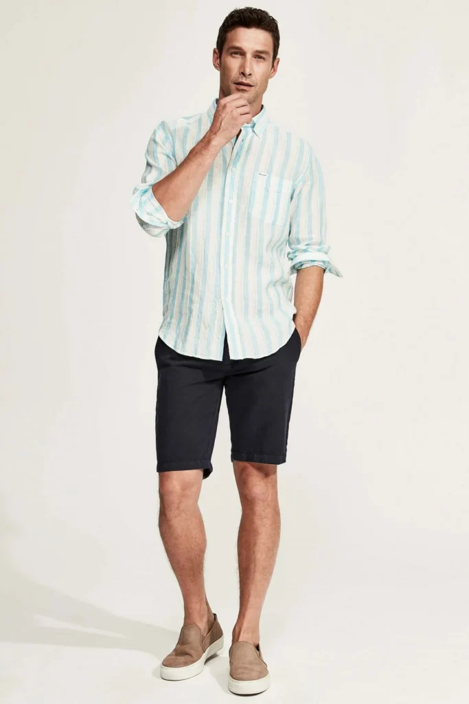 Shorts may not be formalwear, but they can still look smart when styled correctly. A well-fitted shirt paired with tailored or chino shorts creates an effortless smart-casual summer outfit. Finish the look with premium sneakers—slip-ons work especially well—for a polished yet relaxed vibe perfect for warm-weather outings.