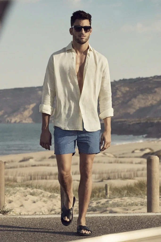 A linen shirt is a summer essential when styled the right way. Pair it with tailored swim shorts for a smart yet relaxed outfit that works seamlessly from the beach to evening drinks. Finish with leather sandals for an effortless, Riviera-inspired look that feels cool, confident, and refined.